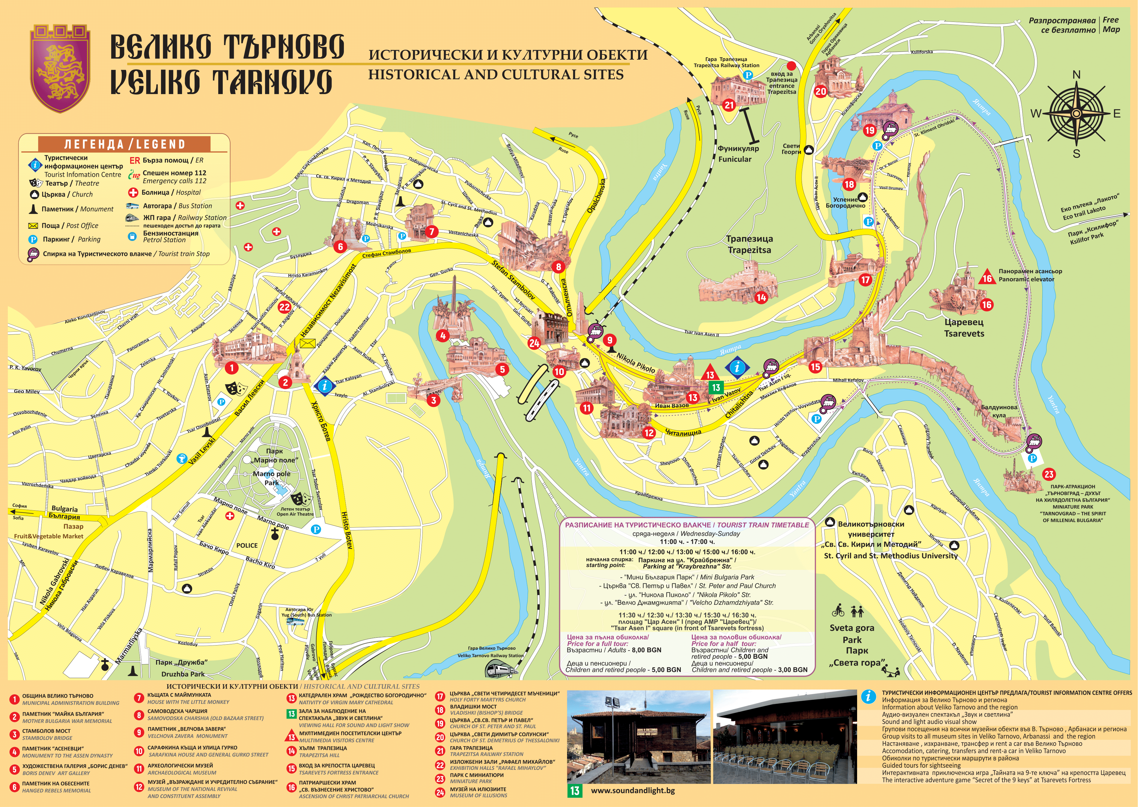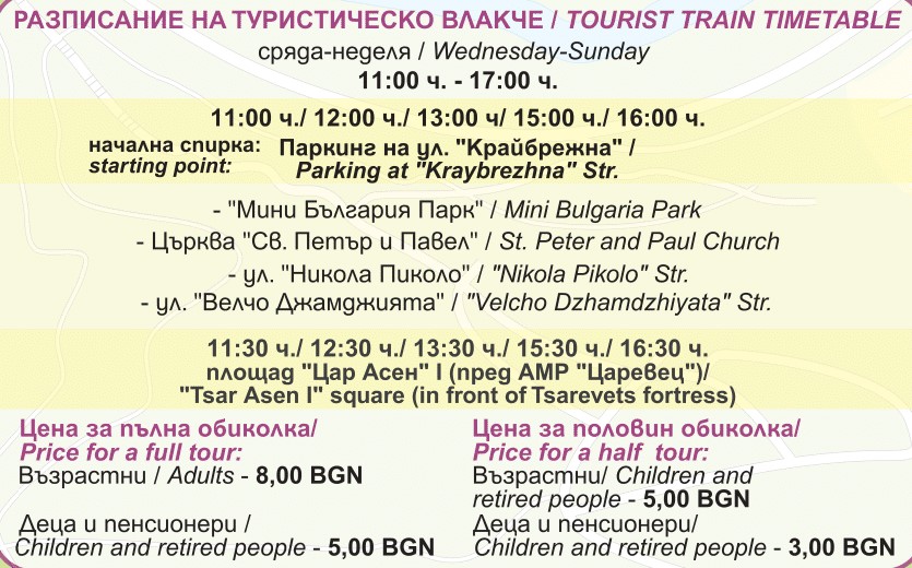 Влакчето потегля на 11:00, 12:00, 13:00, 15:00 и 16:00 ч. от паркинга на ул. "Крайбрежна" и е в 11:30 ч., 12:30 ч., 13:30 ч., 15:30 ч. и 16:30 ч. е на площад "Цар Асен I" пред АМР "Царевец". Цената на пълната обиколка е 8 лв. за възрастни и 5 лв. за деца, а цената на половин обиколка - 5 лв. за възрастни и 3 лв. за деца.